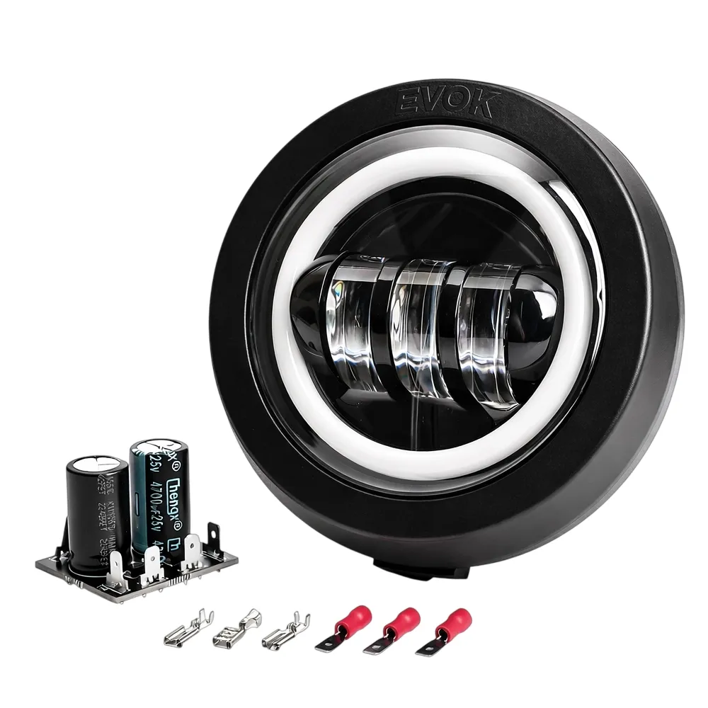 Fanale EVOK anteriore Iron led 6000K tondo 3 lenti angel eyes con circuito di conversione e antisfarfallio.