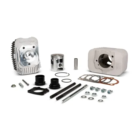 Realizzato con la stessa lega in alluminio ad alta resistenza dei nostri cilindri da corsa e canna con riporto al nichelcromo. Il nocciolo centrale è stato riprofilato in corrispondenza dei travasi per avere una maggiore superficie di scambio termico e una migliore fluidità di scorrimento dell’aria di raffreddamento per permettere alla carica fresca di entrare in camera di combustione alle condizioni di temperatura e pressione ottimali migliorando così il rendimento volumetrico del motore. Nella parte frontale del cilindro è presente un piano di appoggio lavorato e finito con utensili ad elevata precisione, con 4 fori filettati necessari al collegamento del complessivo bocchettone.
